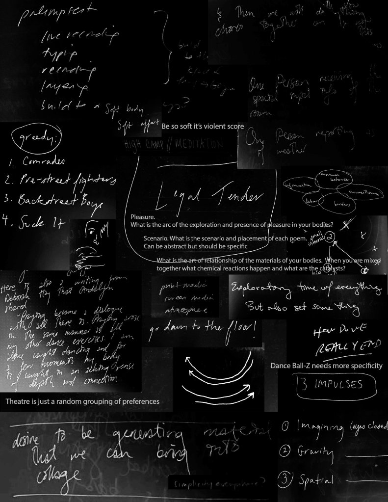 Legal Tender was a live assemblage of multi-media performance, video, and text material drawing across a yearlong collaborative devising practice, its marginalia, and postscript.