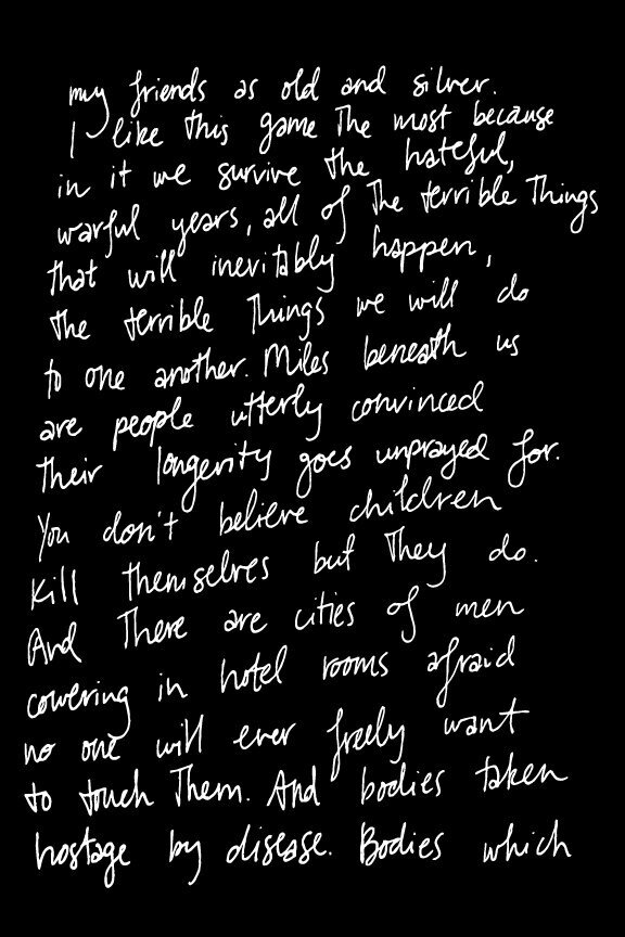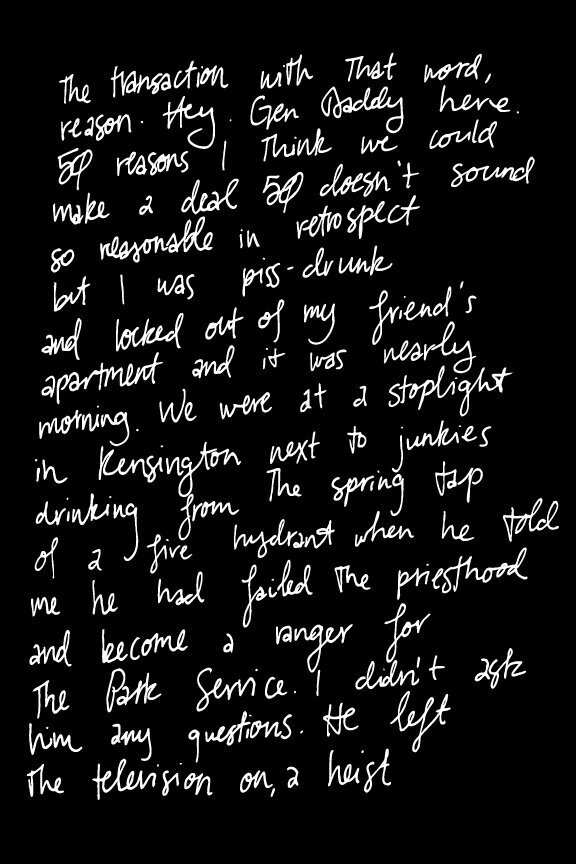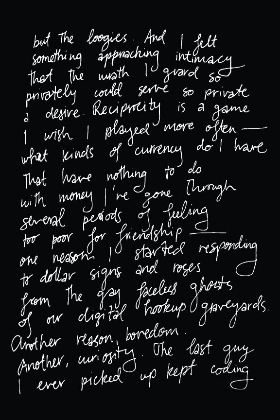 We endeavor to experience the language that waits underneath the obligations we feel for language to mean, to impress, to communicate, to assemble, to work. We support ourselves and one another in finding what barriers may exist for us around the liberation of our respective speech. We try to get ahead of the “endlessly rehearsing, self-canceling behavior” that inhibit the unexpected and uncontainable pleasures of voice. Poetry is what happens when no one is looking. Answer with whatever intuition you have for any question regarding incitements, do anything you want with the material you assemble, and don’t follow any rules you don’t want to.